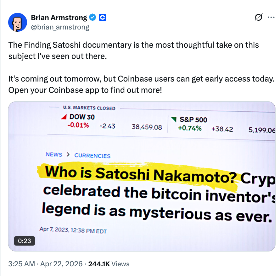 For something altogether more timeless, a new documentary team is actively hunting for the identity of Satoshi Nakamoto, Bitcoin's pseudonymous creator. CoinDesk went inside the effort this week, and while the mystery remains as unresolved as ever seventeen years on, the continued pursuit of it says something interesting about where crypto sits culturally. This is an industry still fascinated by its own origin story, and not entirely sure what it would do with the answer if it found one.